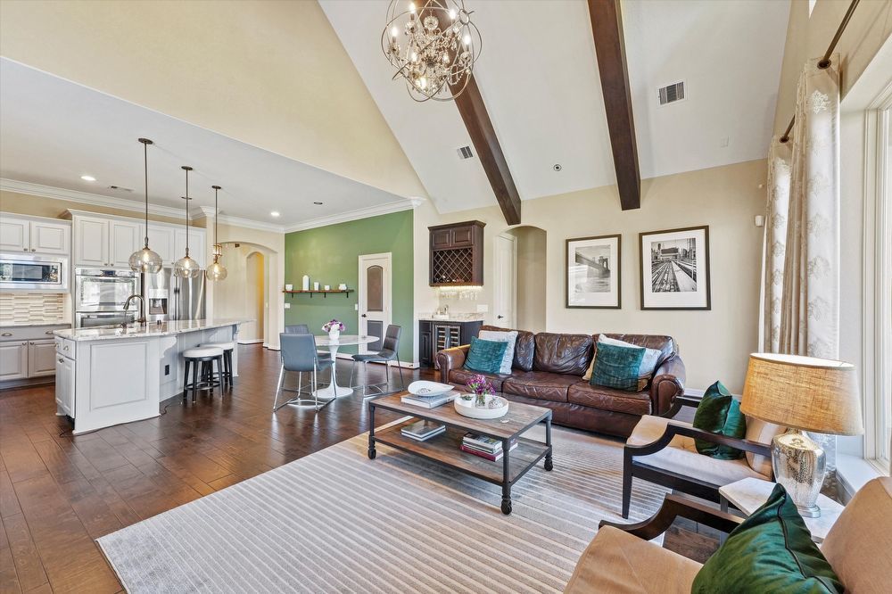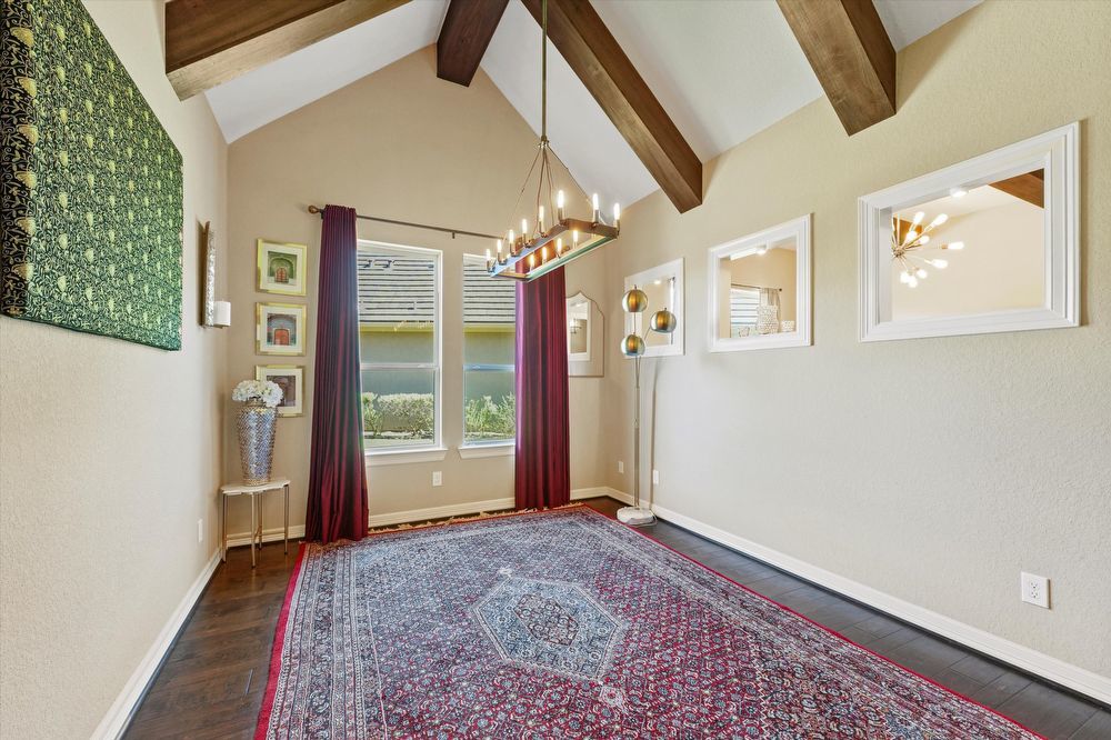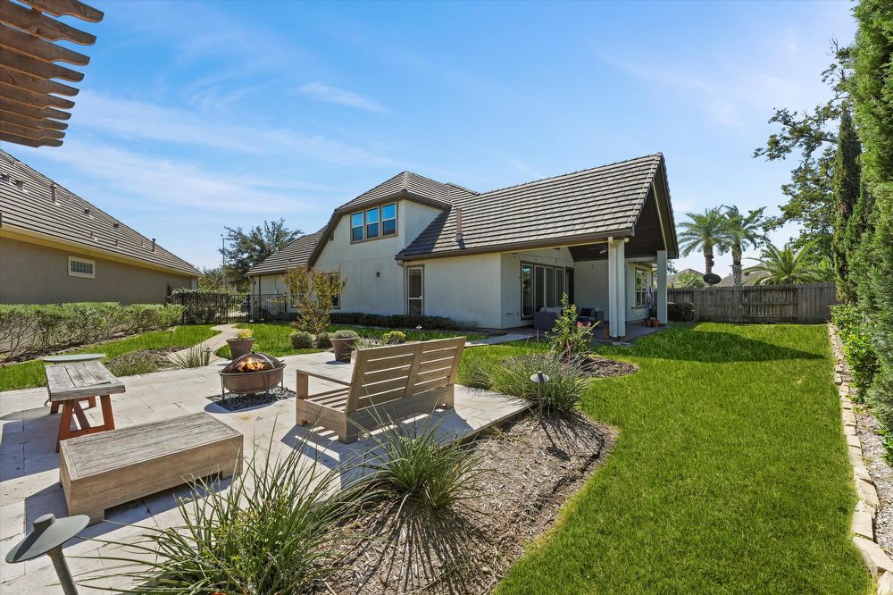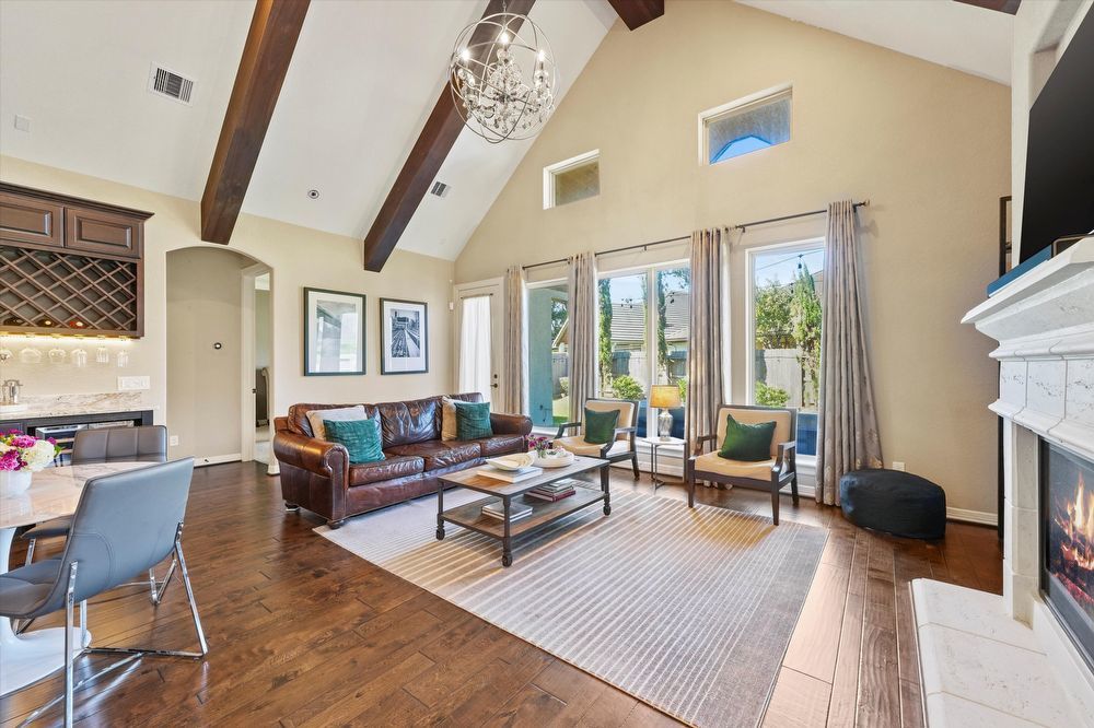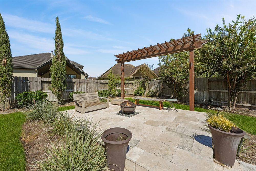 Step inside this stunning two-story home! Inside, you are greeted by a den and family room. The wood beams and vaulted ceilings add a touch of elegance. Home features a game room or play area, and a study room/office! The entertainer's kitchen is a chef's dream, with granite countertops, stainless appliances (fridge & wine fridge included), 2 full ovens, 5 gas burners and a wine bar. The kitchen island provides additional prep space and doubles as a breakfast bar. The living room fireplace is perfect for chilly evenings. The house offers walk-in closets, ensuring plenty of storage. The master bedroom is perfectly-sized, and the shower/jacuzzi tub combo is the ultimate relaxation spot in the modern bath. Outside is a fenced backyard and a covered patio, ideal for a hot cup of coffee or a glass of wine. Enjoy a lovely evening by the fire pit area! Lawn maintenance, washer, and dryer, and a Tesla charging station are provided for your convenience! Move in and start living your best life!