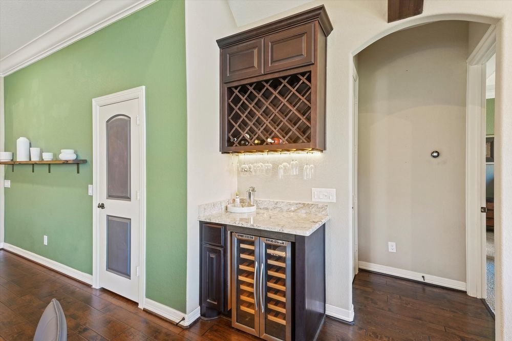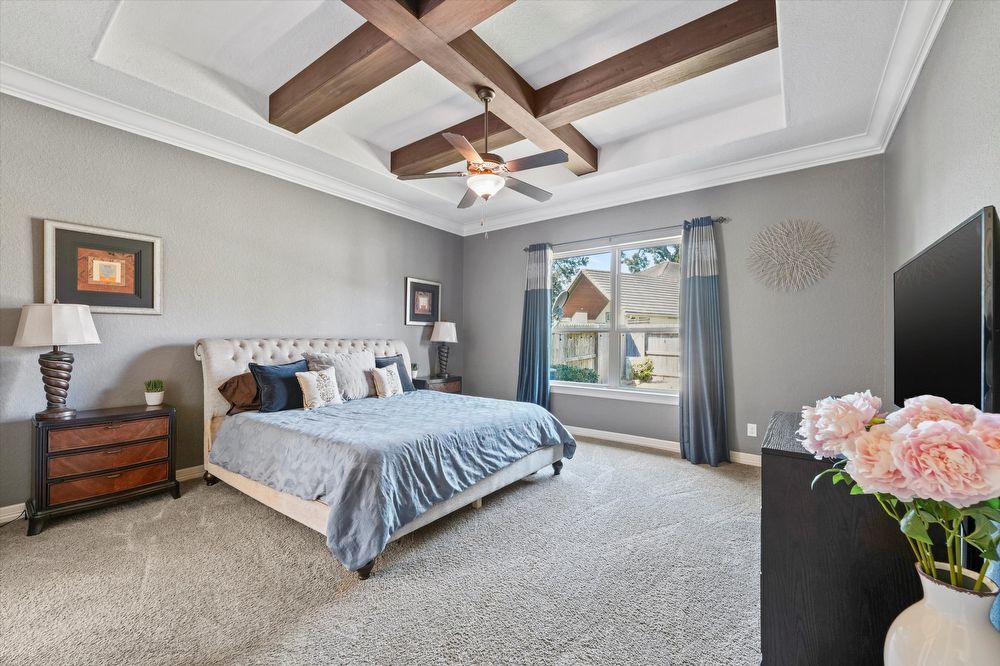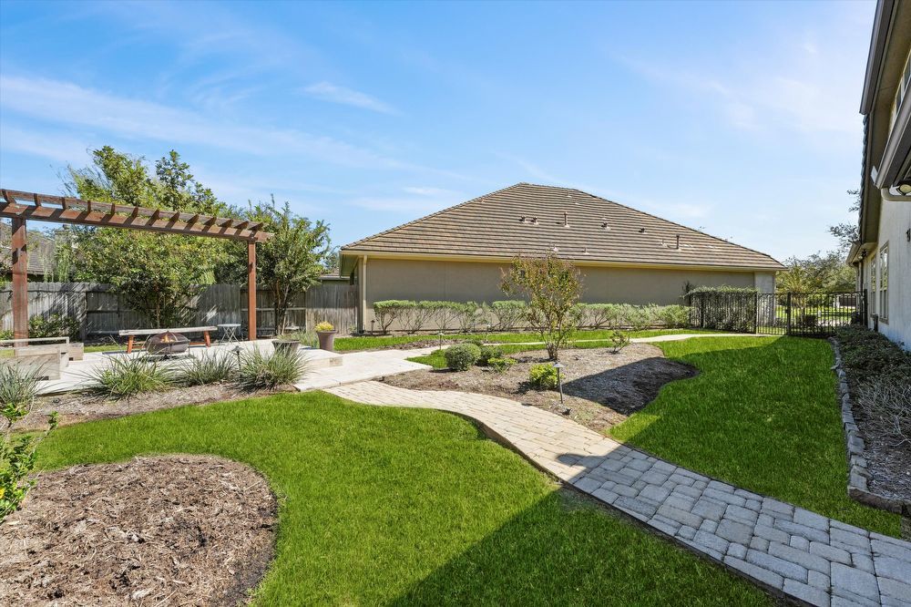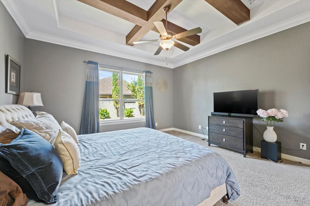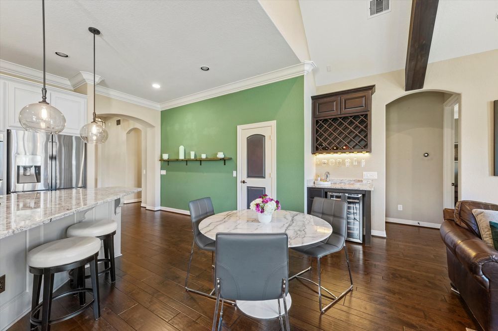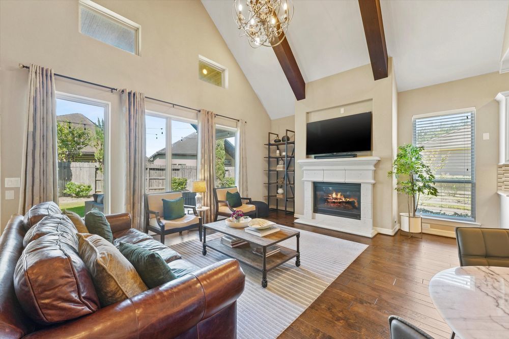 Step inside this stunning two-story home! Inside, you are greeted by a den and family room. The wood beams and vaulted ceilings add a touch of elegance. Home features a game room or play area, and a study room/office! The entertainer's kitchen is a chef's dream, with granite countertops, stainless appliances (fridge & wine fridge included), 2 full ovens, 5 gas burners and a wine bar. The kitchen island provides additional prep space and doubles as a breakfast bar. The living room fireplace is perfect for chilly evenings. The house offers walk-in closets, ensuring plenty of storage. The master bedroom is perfectly-sized, and the shower/jacuzzi tub combo is the ultimate relaxation spot in the modern bath. Outside is a fenced backyard and a covered patio, ideal for a hot cup of coffee or a glass of wine. Enjoy a lovely evening by the fire pit area! Lawn maintenance, washer, and dryer, and a Tesla charging station are provided for your convenience! Move in and start living your best life!
