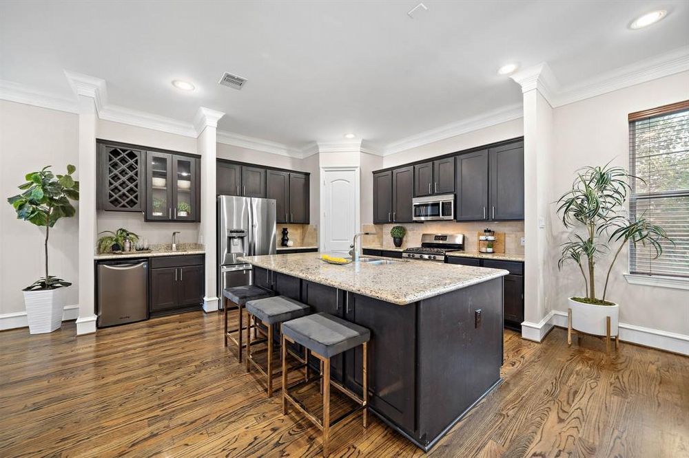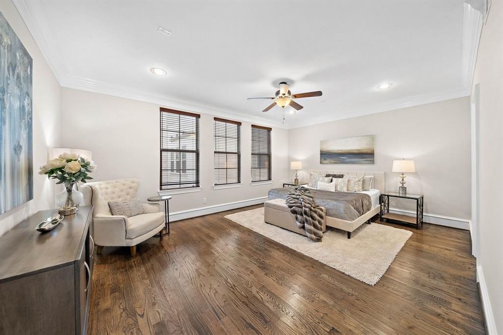 The second floor is a hub of activity with a gourmet kitchen, wet bar, dining area, a spacious living room, and a convenient powder room. The open layout, natural hardwood floors and 11-foot ceilings create an airy and inviting ambiance.