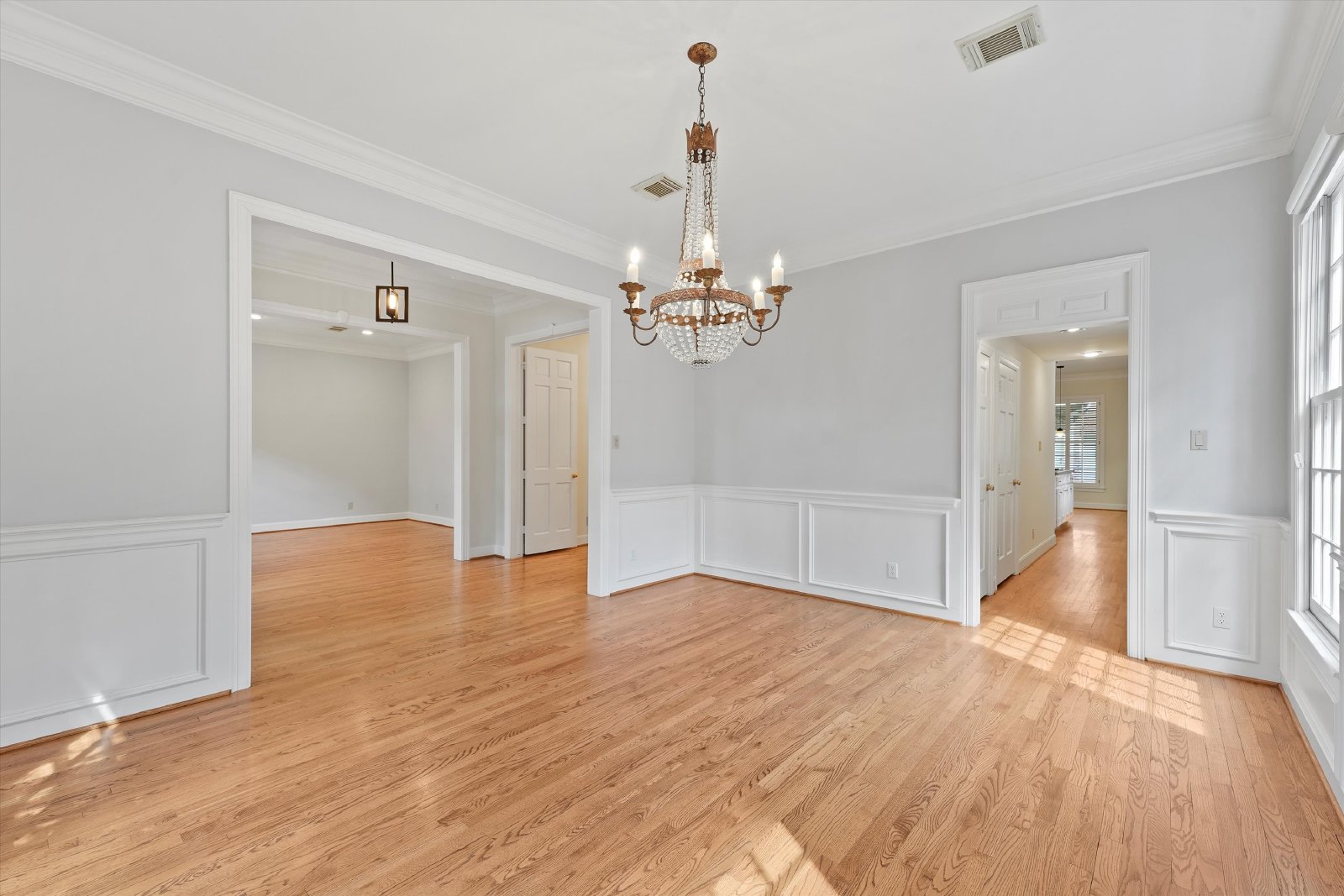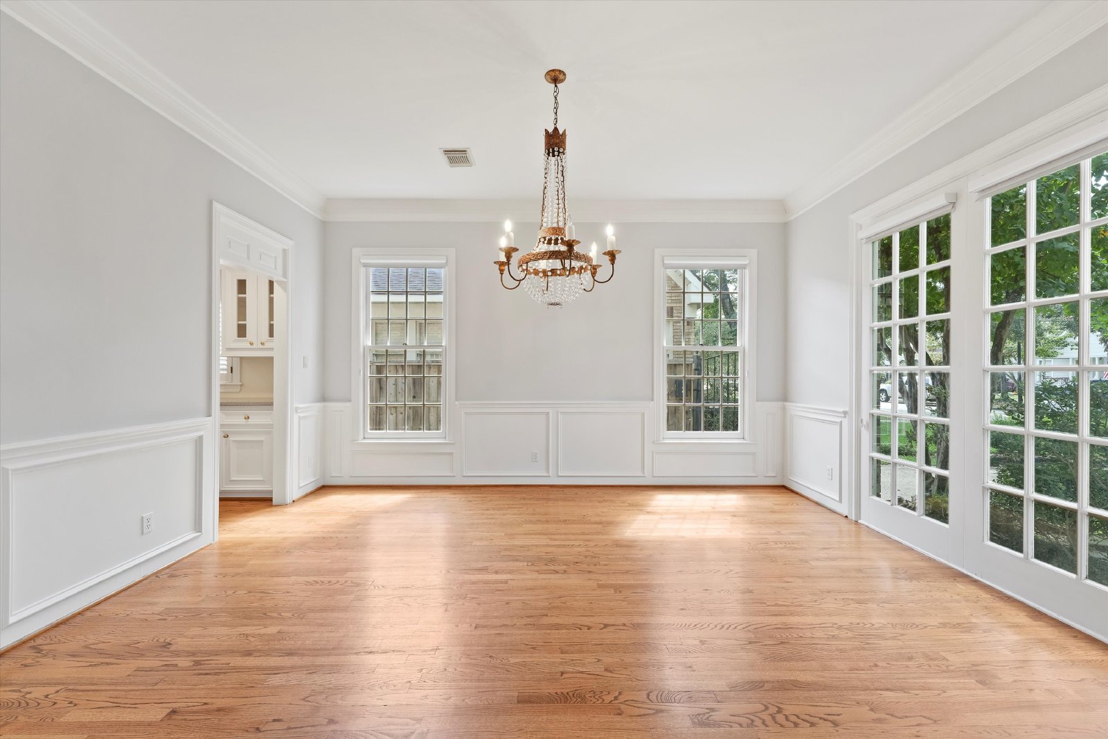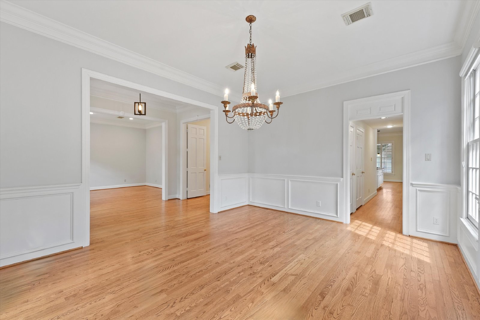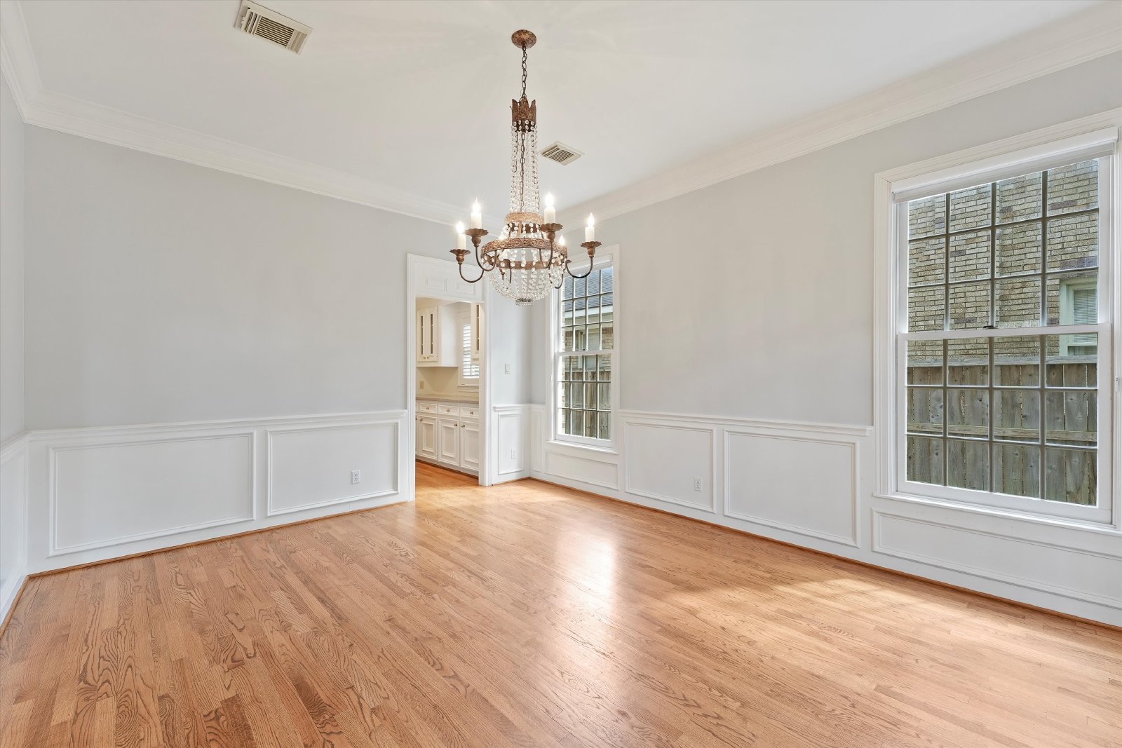 This elegant residence features both formal living and dining rooms, showcasing beautiful hardwood floors that add timeless charm.