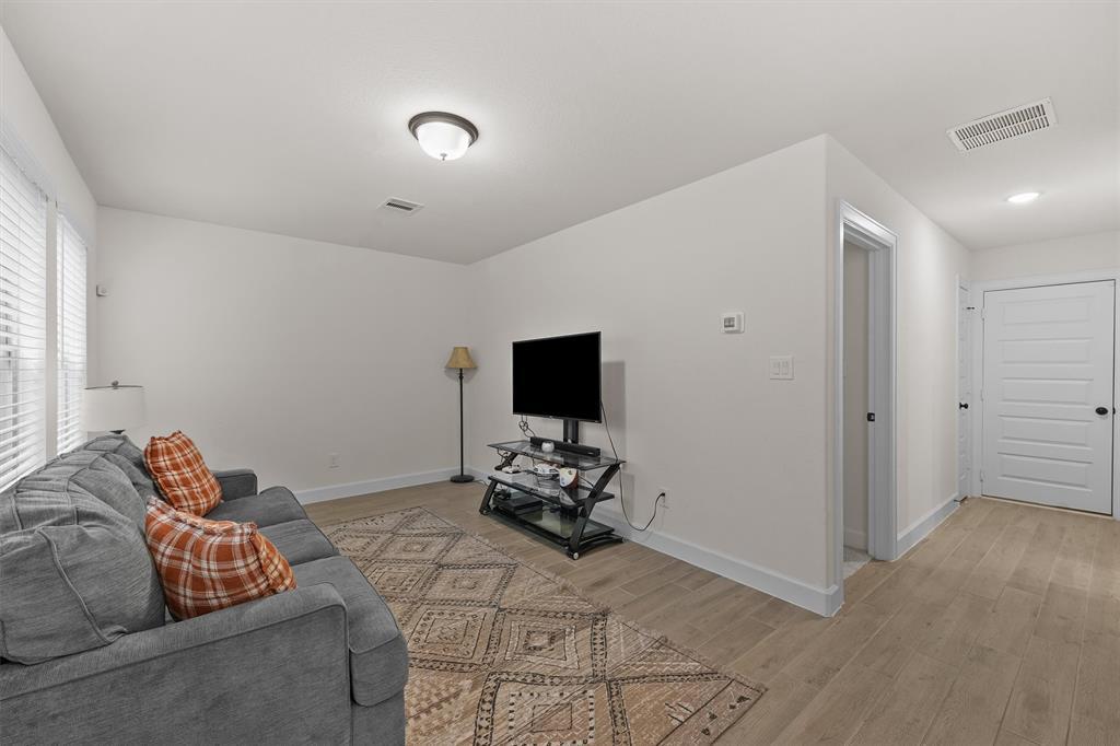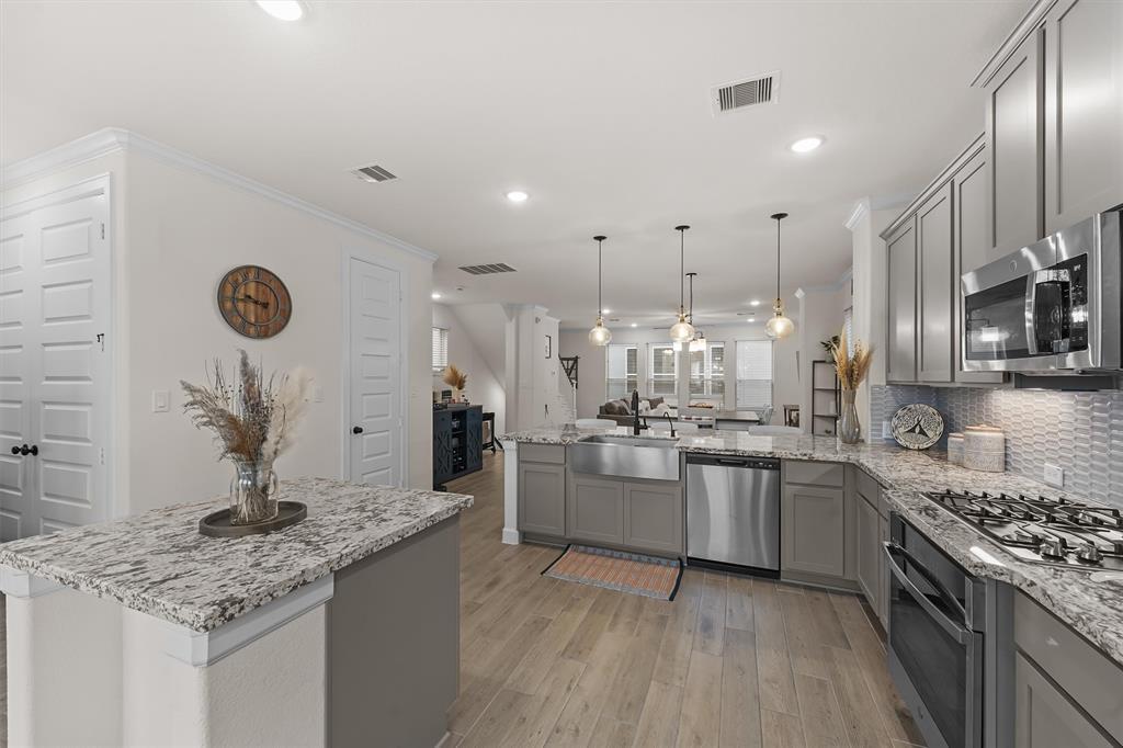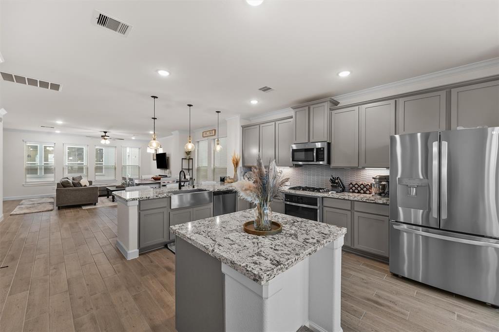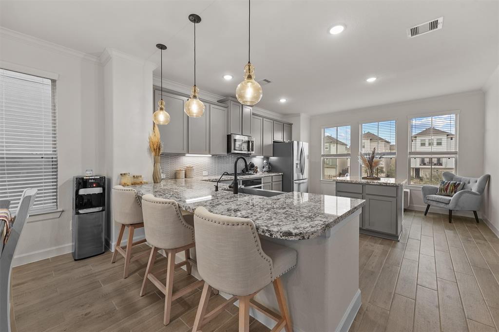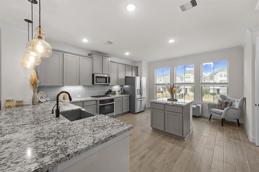 You will not want to miss this spectacular floor plan that offers a spacious, unique and open concept design! The versatile activity room, secondary bedroom and bath are all located downstairs. Beautiful maple cabinets, under cabinet lighting, granite countertops, farmhouse sink and island in gourmet kitchen. Three bedrooms, including owner's suite, located on the 3rd floor. Huge walk-in closet, double sinks, separate tub and shower in owner's luxury bath. Kirby Landing is a privately gated community with easy access to HWY 288 and conveniently located only minutes from Downtown Houston and The Medical Center. Amenities include a centralized walking trail and a gated fun area for four legged friends! Fridge included!