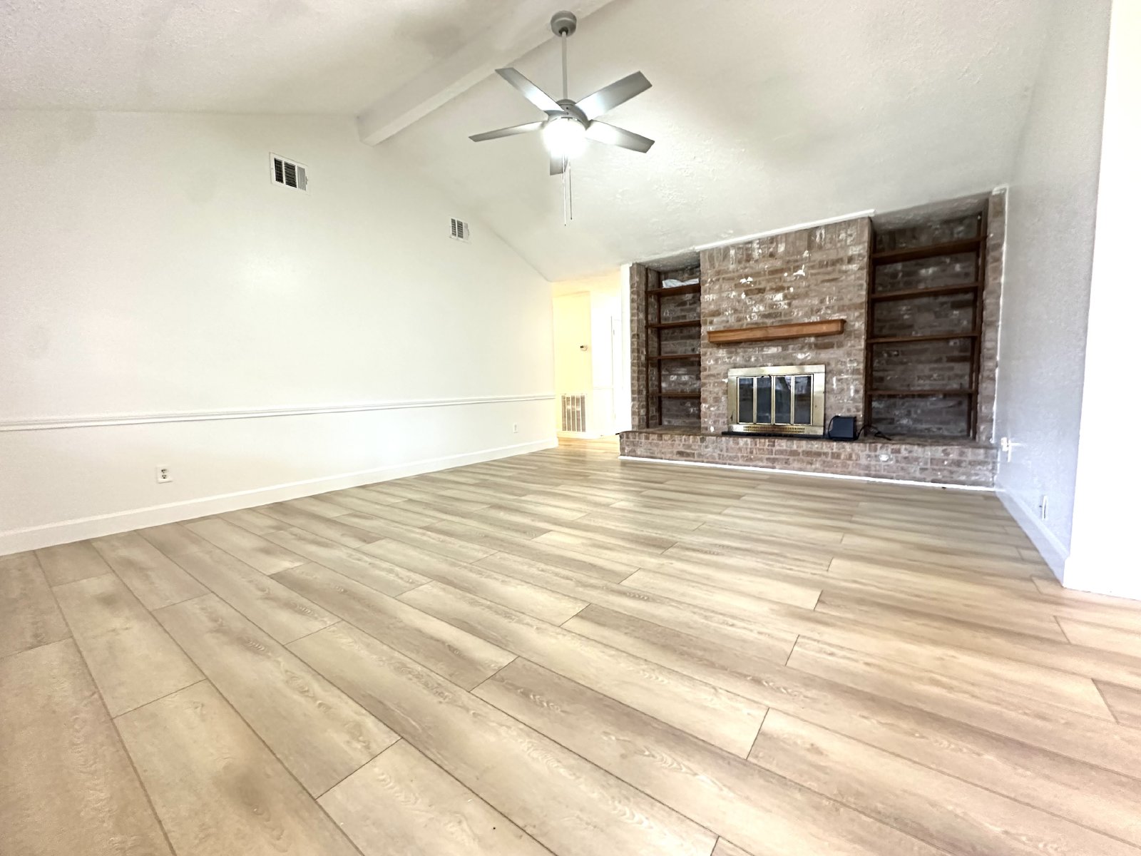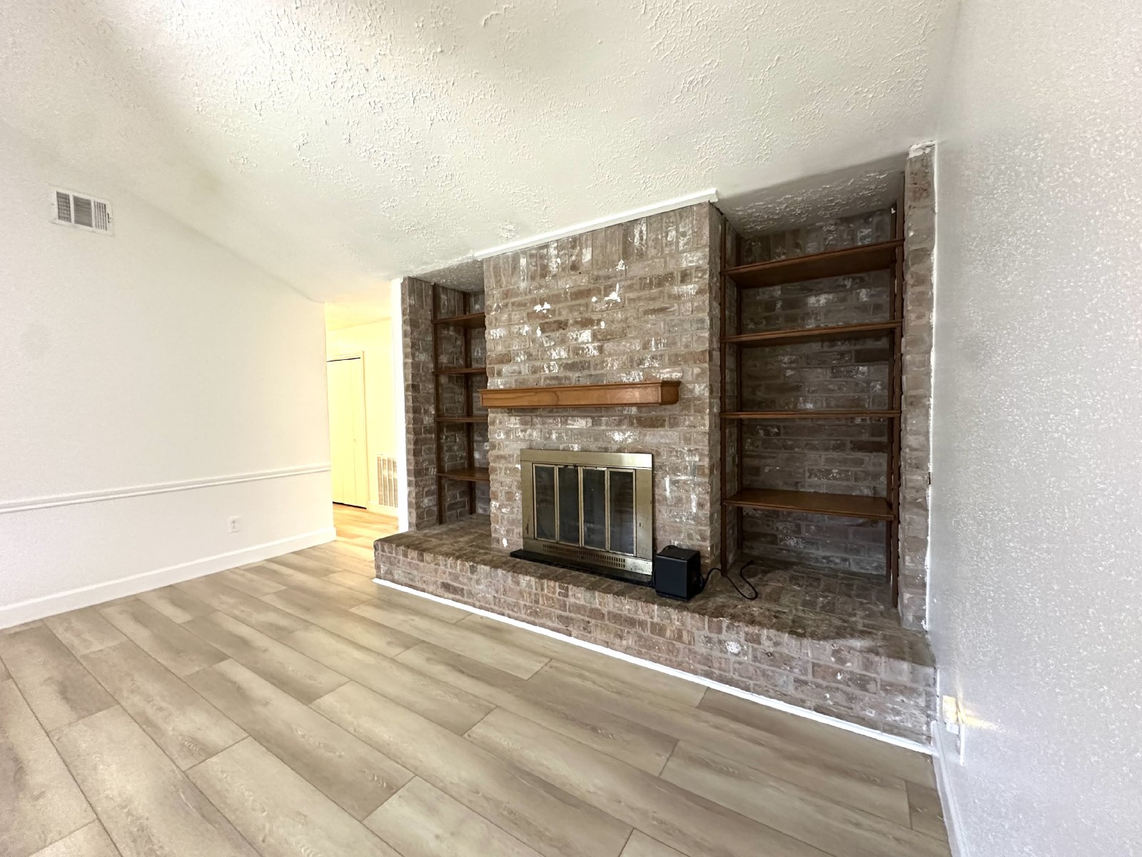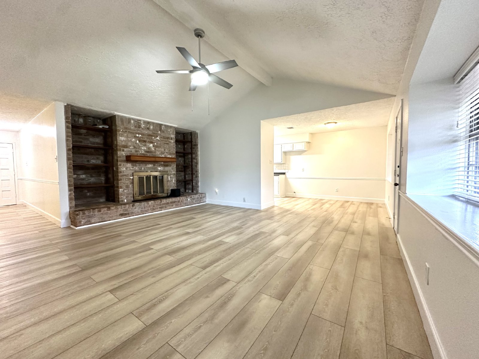 Step inside this inviting four-bedroom, two-bathroom single-family home, where comfort and style meet! The spacious living room greets you with a cozy fireplace surrounded by beautiful brick accents, perfect for unwinding on chilly evenings. The open kitchen/dining area boasts plenty of cabinet space and sleek stainless-steel appliances, making meal prep a breeze. Throughout the home, new wood-like tile flooring adds modern elegance and makes for easy maintenance, including in all the bedrooms.