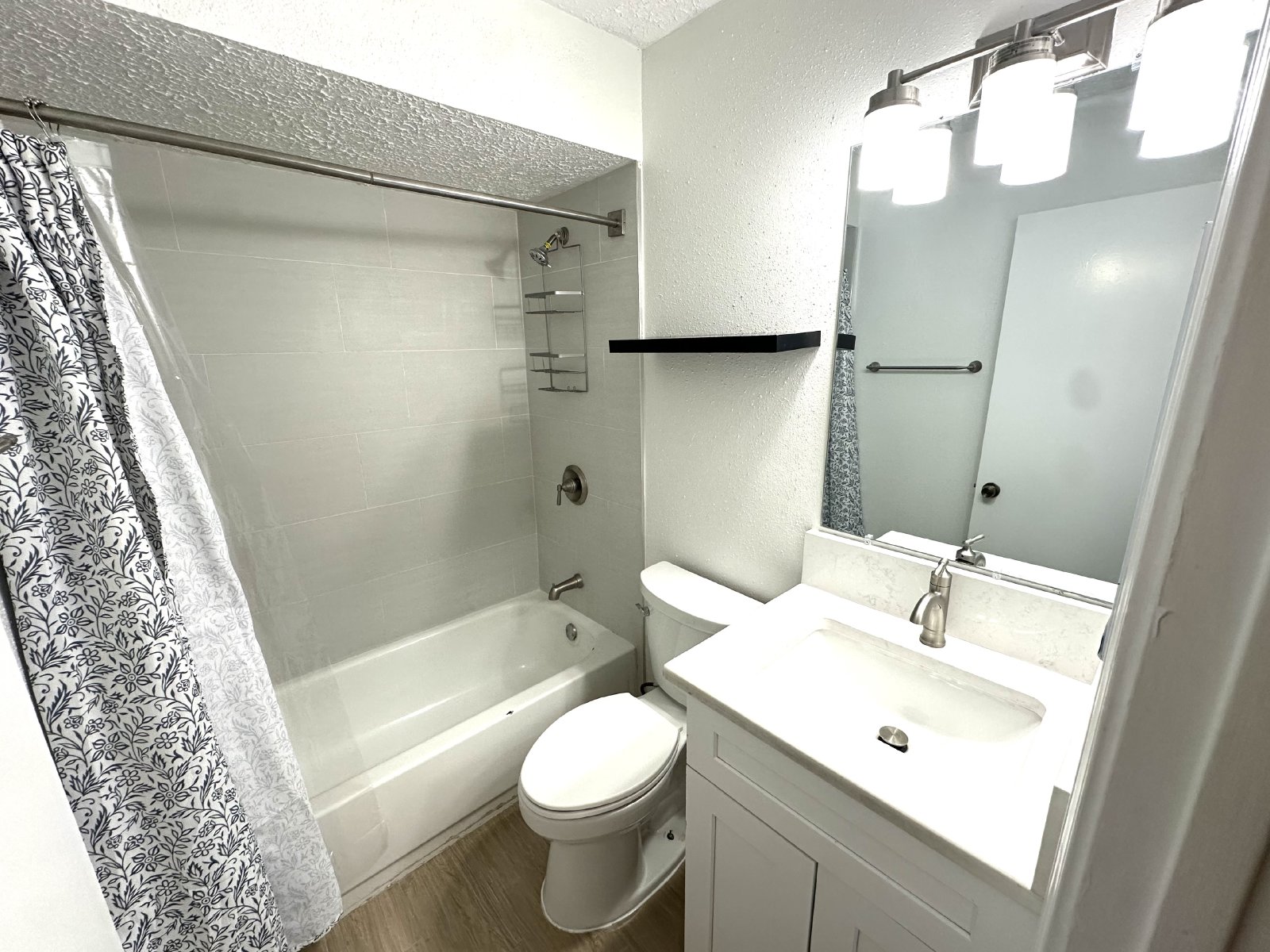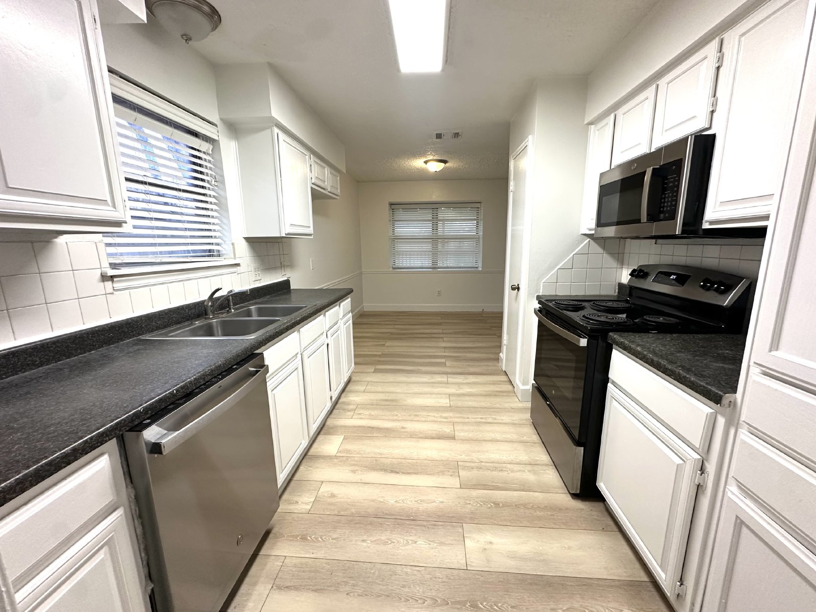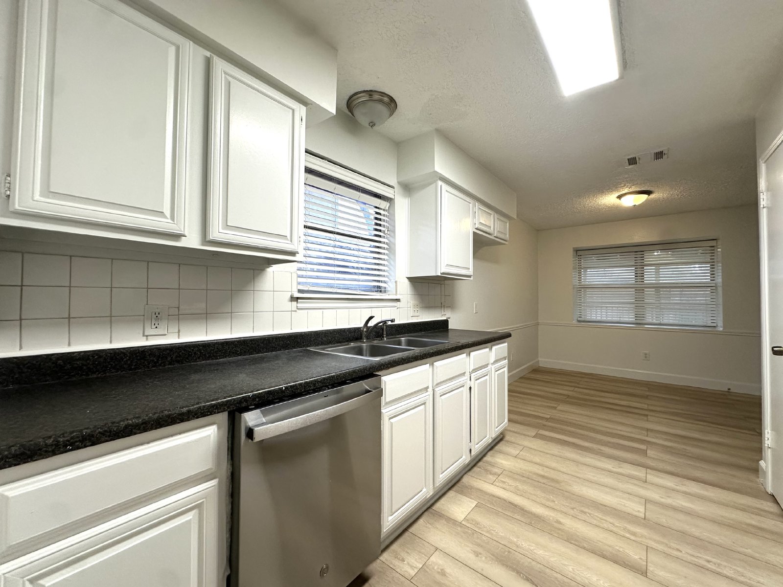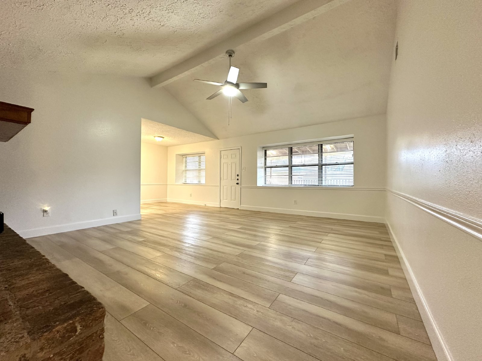 Step inside this inviting four-bedroom, two-bathroom single-family home, where comfort and style meet! The spacious living room greets you with a cozy fireplace surrounded by beautiful brick accents, perfect for unwinding on chilly evenings. The open kitchen/dining area boasts plenty of cabinet space and sleek stainless-steel appliances, making meal prep a breeze. Throughout the home, new wood-like tile flooring adds modern elegance and makes for easy maintenance, including in all the bedrooms.