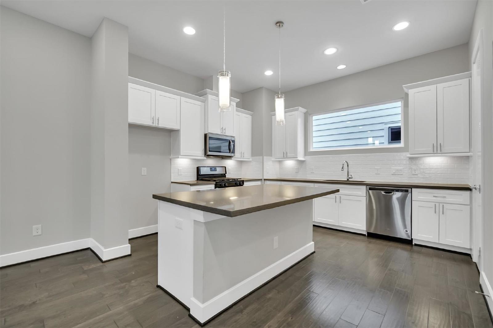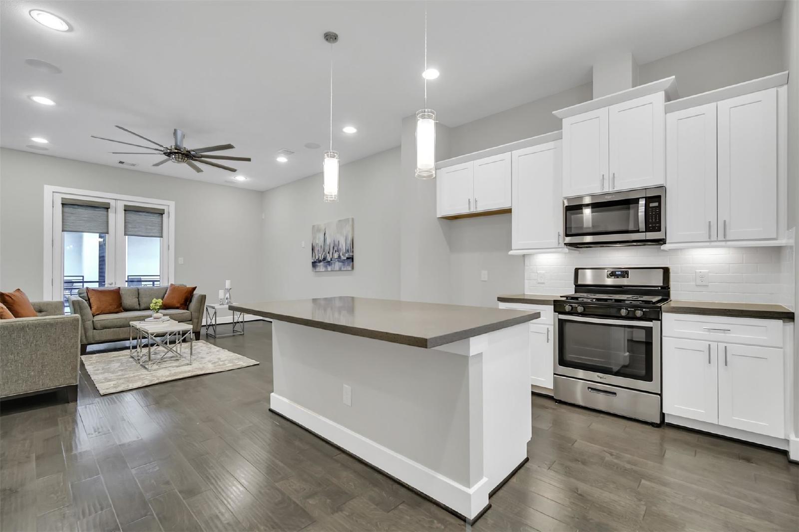 Step inside to find soaring ceilings and abundant natural light. Modern finishes throughout: engineered wood flooring, plush carpeting, and elegant tile and a spacious, open-concept living/dining area with a convenient powder bath on the main floor. The kitchen is a chefs dream with shaker-style cabinets, stainless steel appliances, gas range, large island, and upgraded window coverings.